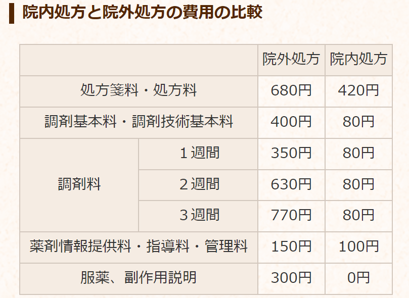 院外処方;薬価(お薬そのもののお値段)+(処680+基400+内630+情150+指300)✕2=薬価+4320円